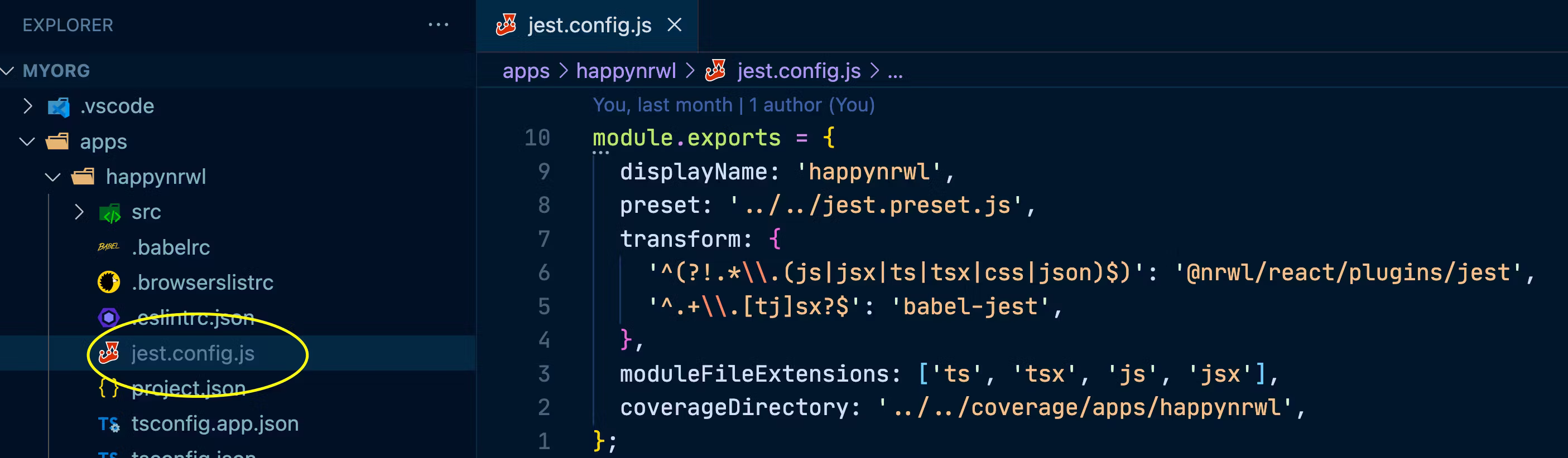 At the root of every project, there's a jest.config.js which already comes with proper transformers to support TypeScript and TSX/JSX. If you need to further customize how Jest should behave for this project, this is the place to do that.
